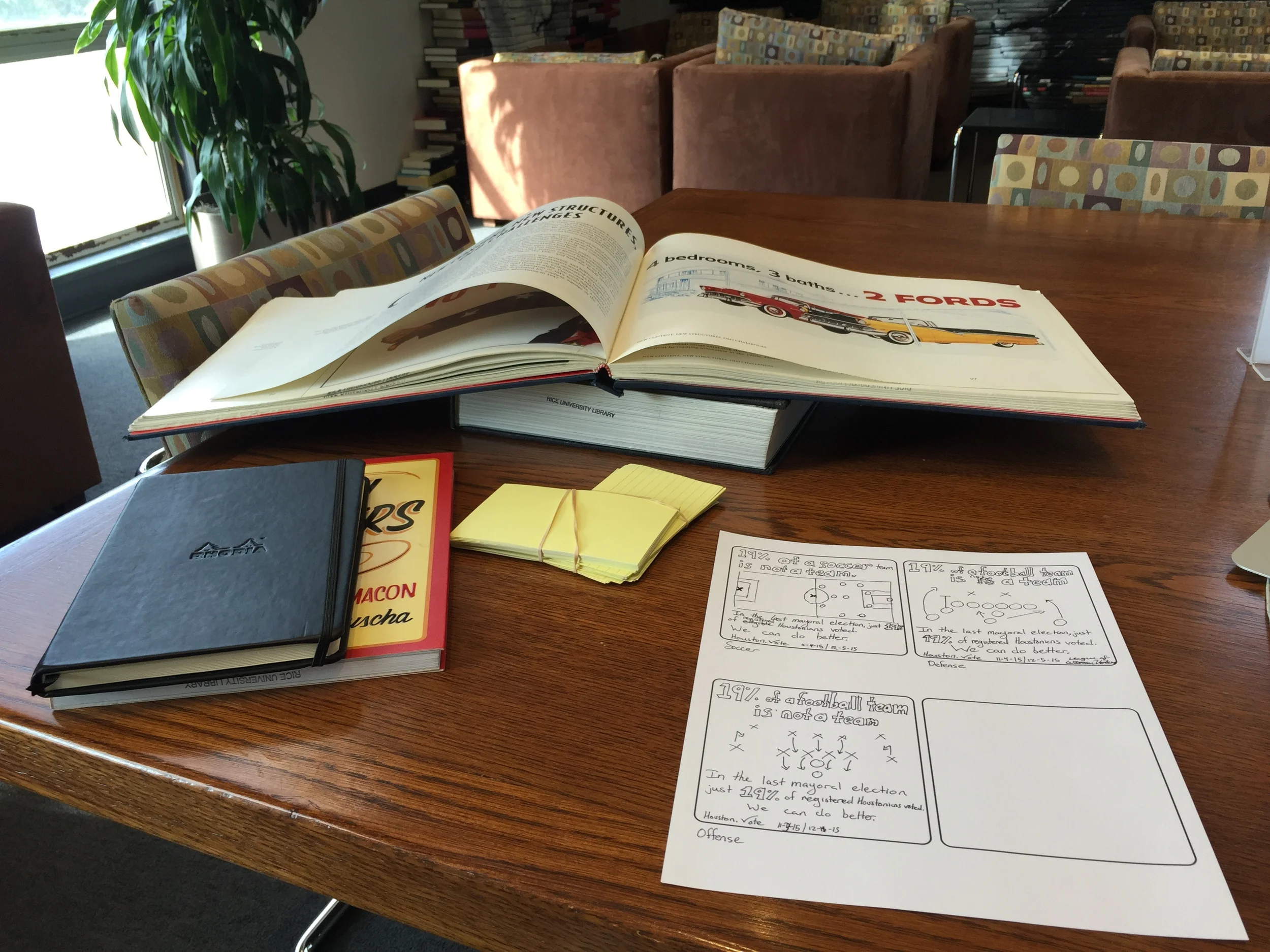 Our first round was focused on a statistic. We looked through a few books and then got started with "What are some ways that we could represent Houston's low voter turnout?" The output was decent, but we realized that the cards weren't coming fast enough and too many ideas were getting stuck in a mental filter.