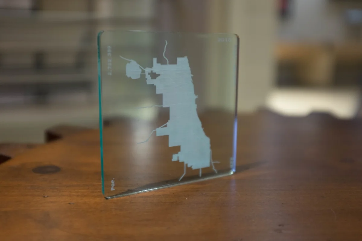 Individual coasters provide a snapshot in time of the city for a specific year: its outlines, population, and square miles of real estate. All of this data is laser etched onto each plexiglass coaster.