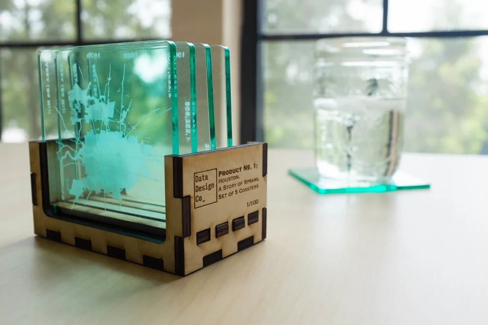 Data Design Co_ is proud to release our first product, a set of coasters that displays the growth of urban sprawl over time. Each coaster set tracks the history of a major city in the United States from their birth to the present day. The first set traces Chicago and Houston from their near similar founding dates of 1833 and 1836 respectively.