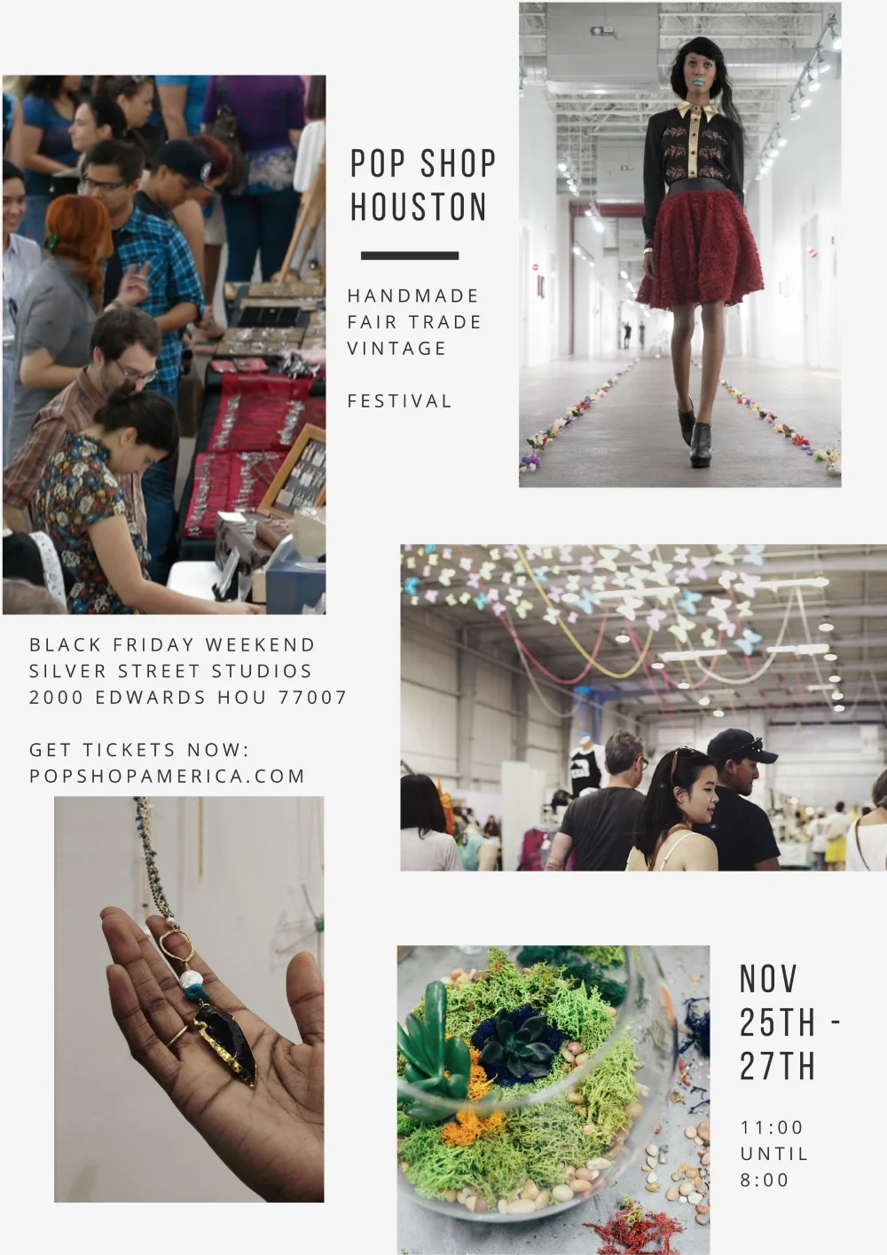 Today through Sunday, November 27th, come visit us at Pop Shop America. One of Houston's most popular arts festivals, there will be music, food and drink, crafts, and hundreds of your favorite Houstonian makers. Tickets are $8 at the door Friday and Saturday, but $5 on Sunday. Pop Shop runs from 11am - 8pm on Friday and Saturday, 12-6pm on Sunday.