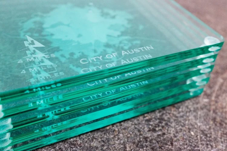 We are proud to announce three new cities today for our City Growth Coaster series: Austin, Boston, and Atlanta. More to come about each of these, but as before each acrylic coaster is etched with a map of the city at a different point in time, creating a window into the history of the city.